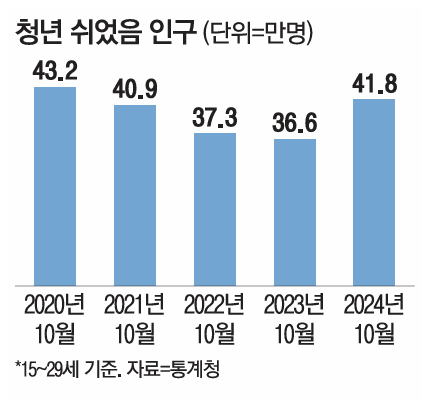 통계상 실업자는 그나마 구직 의사가 있는 경제활동인구에 들어간다. 더 큰 문제는 취업도 실업도 아닌 그냥 쉬는 청년이다. 지난 달 ‘쉬었음’ 청년은 41만 8000명으로 전년동월대비 5만2000명(14.3%) 증가한 것으로 나타났다. 10월 기준으로 볼 때 코로나19 위기였던 2020년 이후 4년만에 최대치다.