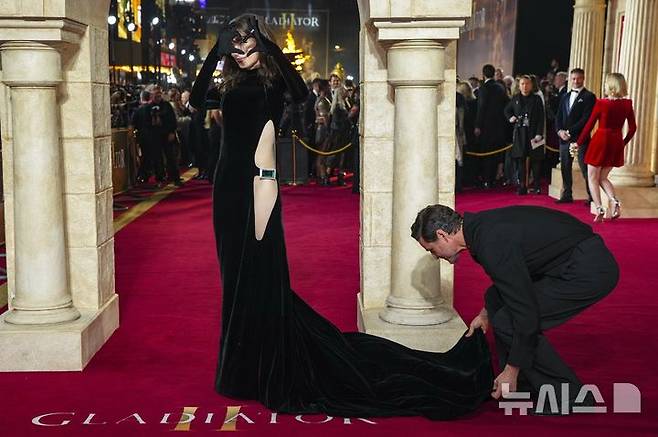 [런던=AP/뉴시스] 배우 페드로 파스칼(오른쪽)이 13일(현지시각) 영국 런던에서 열린 영화 '글래디에이터2' 시사회장에 도착해 트랜스젠더 여동생인 배우 룩스 파스칼의 드레스를 정리해 주고 있다. 2024.11.14.