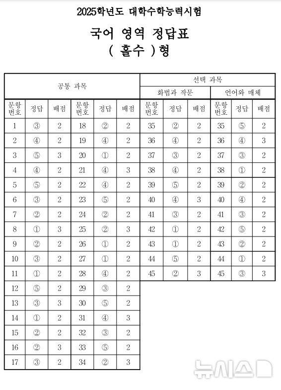 2025학년도 대학수학능력시험 국어영역 정답표 홀수형 정답표. (한국교육과정평가원 제공)