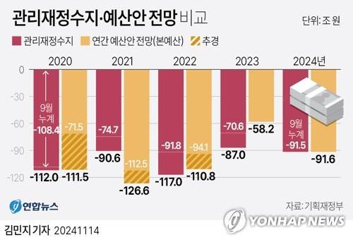 (서울=연합뉴스) 김민지 기자 = 기획재정부가 14일 발간한 '월간 재정동향 11월호'에 따르면 9월 말 누계 관리재정수지는 91조5천억원 적자를 기록해 올해 예산안의 '1년 전망치'인 91조6천억원에 거의 근접했다.
