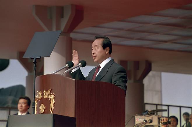 | ▲ 1993년 2월 25일 서울 여의도 국회의사당 앞에서 거행된 제14대 대통령 취임식에서 김영삼 대통령이 취임선서를 하고 있다. |