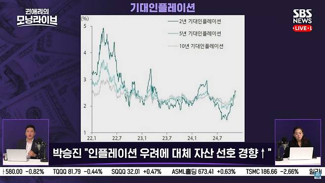 박승진 팀장 : 최근 주식시장에서는 트럼프 트레이드의 색깔이 조금씩 빠지는 그림들이 나오는 것 같습니다. 최근 은행주나 중소형주도 조금씩 탄력이 둔화되고, 비트코인은 계속 가고 있지만 코인 베이스는 살짝 쉬는 그림들이 잠깐씩 나오고 있고, 결국 너무 많이 올랐기 때문에 이제 기술적으로 좀 쉬는 그림들이 일부 나올 수 있는 타이밍은 되긴 한 것 같습니다.