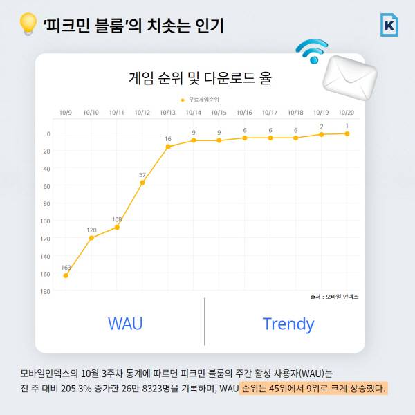 피크민 블룸은 이러한 요소들이 결합하여 MZ 세대의 특별한 경험과 라이프스타일을 담은 앱으로 자리 잡았다. 모바일인덱스의 10월 3주 차 통계를 보면 피크민 블룸의 주간 활성 사용자(WAU)는 전주 대비 205.3% 증가한 26만8323명을 기록하며, WAU 순위는 45위에서 9위로 크게 상승했다. 이 같은 유저들의 호응은 SNS에서도 확인할 수 있다. 피크민 블룸을 통해 귀여운 캐릭터를 공유하고, 게임 플레이 노하우나 협력을 요청하는 모습은 게임이 많은 이들에게 편안한 안식처가 되고 있음을 보여준다.
