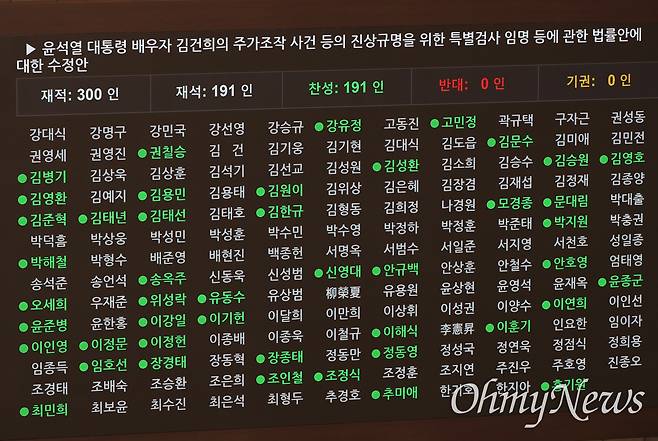 | ▲ 세 번째 '김건희 특검법' 표결 결과 14일 오후 열린 국회 본회의에서 처리된 세 번째 '김건희 특검법' 표결 결과가 본회의장 전광판에 표시돼 있다. 특검법은 재석 191인 중 찬성 191표, 반대 0표, 기권 0표로 통과됐다. 표결에 참여해 찬성표를 던진 의원 이름은 녹색으로, 표결에 불참한 의원 이름은 흰색으로 표시돼 있다. 국민의힘 의원들은 특검법 표결 직전 전원 퇴장했다. |