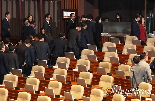 | ▲ '김건희 특검법' 표결 직전 퇴장하는 국민의힘 국민의힘 의원들이 14일 오후 열린 국회 본회의에서 세 번째 '김건희 특검법' 표결 직전 전원 퇴장하고 있다. |