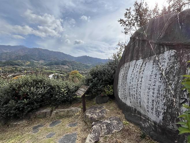 | ▲ 산수유 사랑 공원 내 한쪽에 세워진 '산동애가' 노래비. 아래로 야외 공연장이 있고, 저 멀리 지리산 능선이 펼쳐져 있다. |