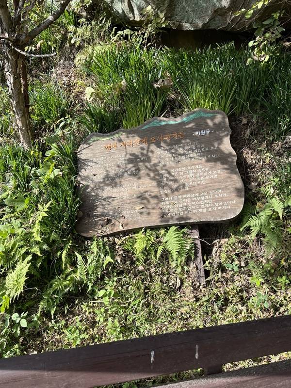 | ▲ 뽑힌 채 바닥에 나뒹굴고 있는 '행여 지리산에 오시려거든' 나무 시비. 이원규 시인의 작품으로 가수 안치환이 곡을 붙여 널리 불린 노래이기도 하다. |