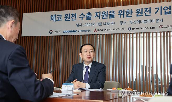 (서울=연합뉴스) 이명구 관세청 차장이 14일 경남 창원시 소재 두산에너빌리티에서 원전 협력업체 관계자들과 간담회를 개최, 관계자들과 이야기를 나누고 있다. 2024.11.14 [관세청 제공. 재판매 및 DB 금지]