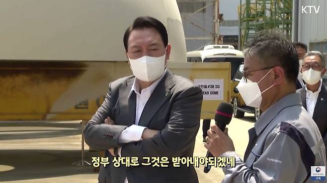 | ▲ 윤석열 대통령은 2022년 6월 22일 두산에너빌리티 방문 당시 신한울 3·4호기 건설 재개에 대해 "최대한 시간을 단축해 추진하겠다"고 밝혔다. 현장 방문 당시 상황을 KTV는 "두산에너빌리티 방문한 윤 대통령! 원전 최강국으로 도약하기 위해 또 약속했다! 윤석열 대통령 창원 원전산업 협력업체 현장 방문 간담회 풀영상(https://www.youtube.com/watch?v=VWIP_JVV6Lk)"이란 제목으로 전했다. |