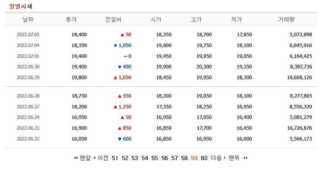 | ▲ 두산에너빌리티(전 두산중공업)의 2022년 6월 22일 ∼ 7월 5일 일별 시세 상황. |