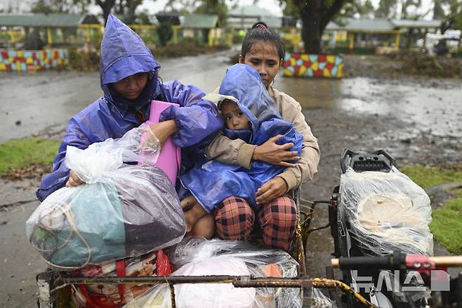[산타아나=AP/뉴시스] 14일(현지시각) 제25호 태풍 우사기가 필리핀으로 접근함에 따라 북부 카가얀주 산타아나의 한 가족이 임시대피소로 사용되는 학교에 도착하고 있다. 2024.11.14.
