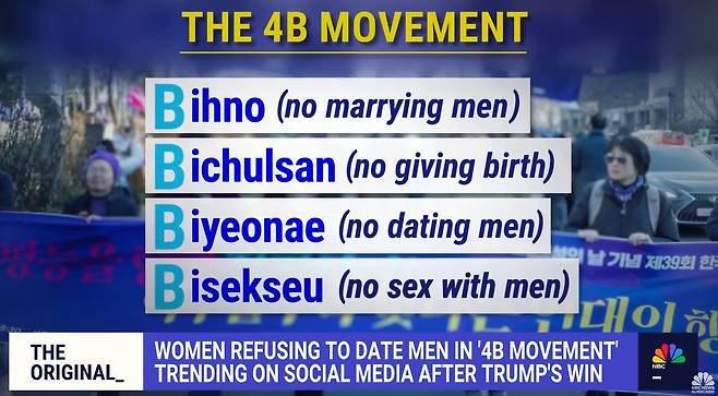 | ▲ 미국 nbc news <'4B' movement picks up steam in U.S. after election> 보도 영상 중 일부. bihno는 bihon(비혼)의 오타로 보인다. |