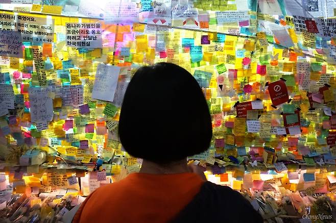 | ▲ 2016년 5월 22일, 강남역 10번 출구에 마련된 '강남역 살인 사건' 추모 장소를 바라보는 한 시민의 모습. |