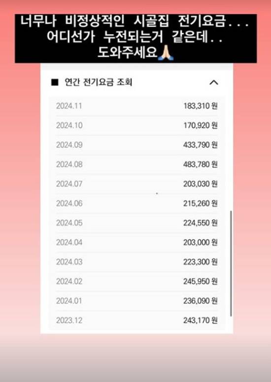 공개된 명세서 속 아이비의 집 전기요금은 최저가 20만 원대로, 올해 8월과 9월엔 40만 원대까지 치솟아 있는 모습이다. 이에 아이비는 "너무나 비정상적인 시골집 전기요금. 어디선가 누전되는 거 같은데 도와주세요"라는 글을 덧붙여 도움을 구했다.