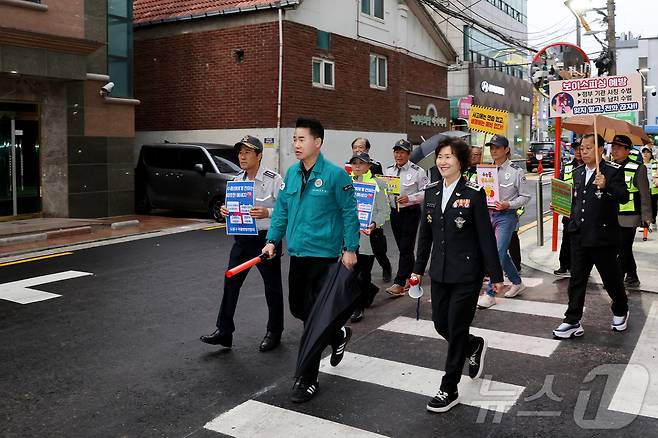 (서울=뉴스1) = 오언석 도봉구청장이 대학수학능력 시험이 끝난 14일 오후 쌍문역 인근에서 도봉구 자율방범연합대 등과 함께 수능 청소년 선도‧보호 활동을 하고 있다. (도봉구 제공) 2024.11.14/뉴스1