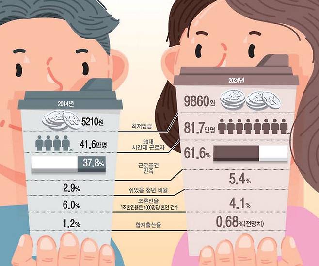 최저임금이 두 배 가까이 오른 지난 10년간 인구 1000명당 혼인 건수는 6건에서 4건으로 줄어들었다. 출산율도 동반 하락했다.