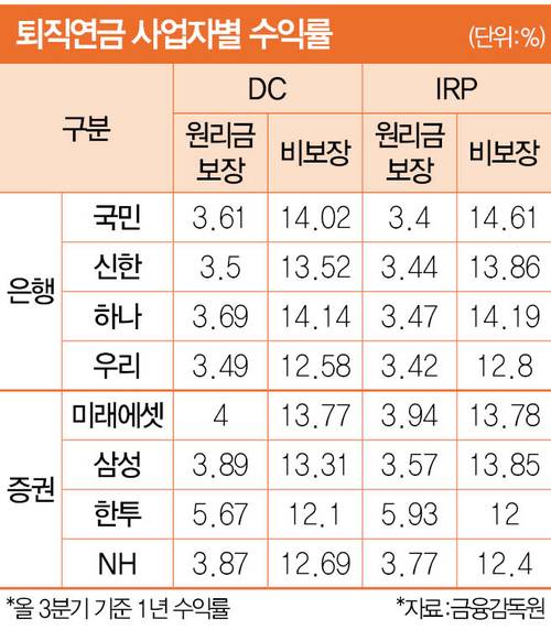 확정기여형(DC)에선 은행권과 증권사가 각축을 벌이는 구도다. 확정기여형·원리금 보장형은 한국투자증권 5.67%를 선두로 미래에셋증권 4%, 삼성증권 3.89%, 삼성생명 3.76%, 교보생명 3.74% 등 증권·보험사 수익률이 좋았다. 하나은행(3.69%), 미래에셋생명(3.66%), 국민은행(3.61%), 기업은행(3.52%), 신한은행(3.5%) 등은 3% 중반대로 뒤를 이었다. 확정기여형·원리금 비보장형은 하나은행 14.14%, 국민은행 14.02%, 미래에셋증권 13.77%, 신한은행 13.52%, 삼성증권 13.31%, 기업은행 12.42%, 한국투자증권 12.1% 등 은행권과 증권사가 엎치락뒤치락했다.