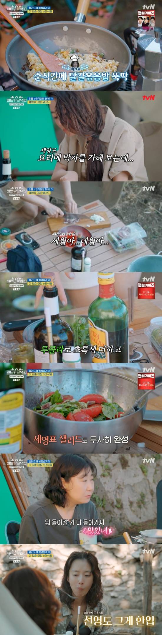이세영이 샐러드를 만드는 사이 라미란은 달걀 볶음밥을 요리했다. 라미란은 곽선영과 이주빈의 도움을 받아 샐러드를 완성했다.