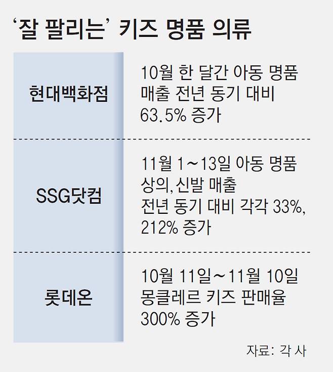 키즈 명품 의류는 소셜네트워크서비스(SNS)와 중고 거래 플랫폼을 중심으로 입소문을 타며 인기가 오르고 있다. 현대백화점의 지난달 자사 매장 아동 명품 매출은 전년 동월 대비 63.5% 늘었다. 현대백화점 관계자는 “본인 옷을 사기 위해 키즈 명품 매장을 찾는 20대 여성 고객이 늘었다”고 말했다. 실제 해당 매장들에서 20대 여성이 차지하는 매출 비중은 전년 동기 대비 15%가량 높아졌다.