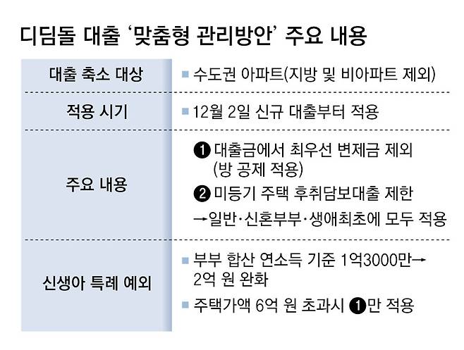 수도권 아파트에 대해 디딤돌 대출을 받을 때 소액 임차인을 위한 최우선 변제금만큼 대출 한도를 줄이고(방 공제 적용), 미등기 신축 아파트 대출(후취 담보 대출)을 허용하지 않는 게 주요 내용입니다.