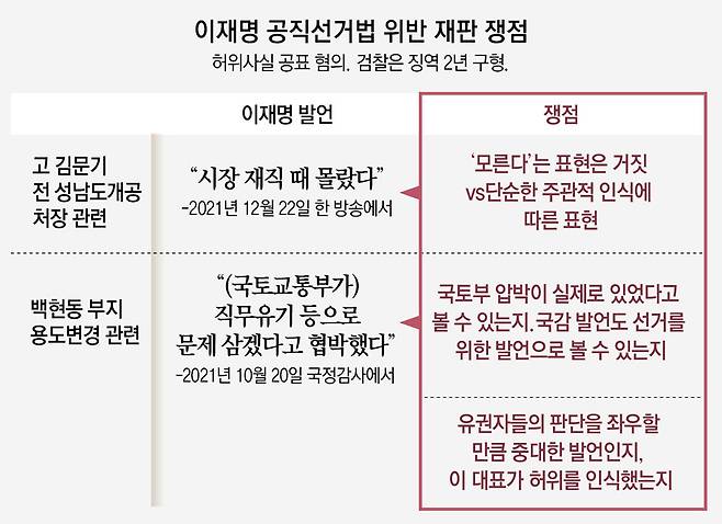 이 대표는 민주당 대선 후보였던 2021년 12월 한 방송에 나와 대장동 사업 실무를 맡은 고 김문기 전 성남도시개발공사 개발사업1처장에 대해 “하위 직원이라 시장 재직 때는 몰랐다”고 말하는 등 허위사실을 공표한 혐의를 받고 있다. 같은 해 10월 국회 국토교통위 국정감사에서 백현동 부지 용도 변경과 관련해 국토교통부의 협박이 있었다는 허위 발언을 한 혐의도 있다. 이 대표에게 적용된 공직선거법 250조는 ‘당선될 목적으로 연설·방송 등 방법으로 출생지·가족관계·직업·경력·재산·행위 등에 관해 허위의 사실을 공표한 자를 처벌한다’고 규정하고 있다.