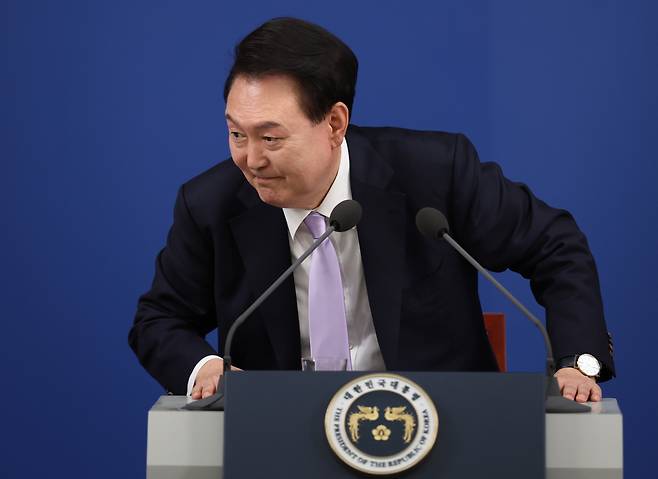 | ▲ 윤석열 대통령이 7일 오전 서울 용산 대통령실 청사 브리핑실에서 '대국민담화 및 기자회견'을 마치고 자리에서 일어나고 있다. 사과 이틀 후 골프장을 찾았다가 언론에 포착되자, 대통령실은 '도널드 트럼프 미국 대통령 당선자와 회동을 준비하려고 8년 만에 골프채를 다시 잡았다'고 밝혀 거짓 해명 논란을 키웠다. |