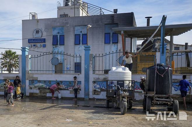 [가자지구=AP/뉴시스] 14일(현지시각) 가자지구 데이르알발라 팔레스타인 주민들이 전쟁 중 접근할 수 없었던, 24시간 가동 담수 시설에서 깨끗한 식수를 받고 있다. 2024.11.15.