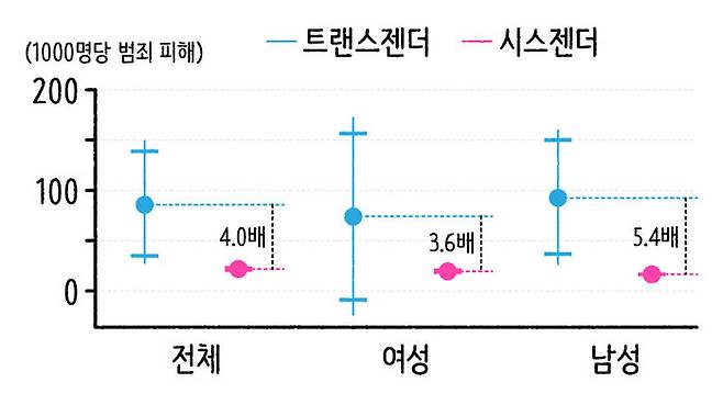 연구진은 2017년과 2018년 미국의 범죄 피해 조사 결과를 바탕으로 트랜스젠더와 시스젠더의 폭력범죄 피해율을 분석해 봤습니다. 분석해 보니 트랜스젠더는 시스젠더에 비해 폭력범죄 노출 가능성이 무려 4배나 높았죠. 트랜스젠더의 1,000명당 범죄 피해 건수는 86.2인 반면 시스젠더는 21.7에 불과했습니다. 트랜스젠더 중에서도 트랜스젠더 남성의 범죄 피해 건수가 107.5건으로 가장 높았습니다. 시스젠더 남성(19.8)과는 5배 이상 차이가 납니다. 이 연구 결과에 따르면 트랜스젠더는 도리어 범죄 피해를 더 많이 보는 피해자라는 거죠.