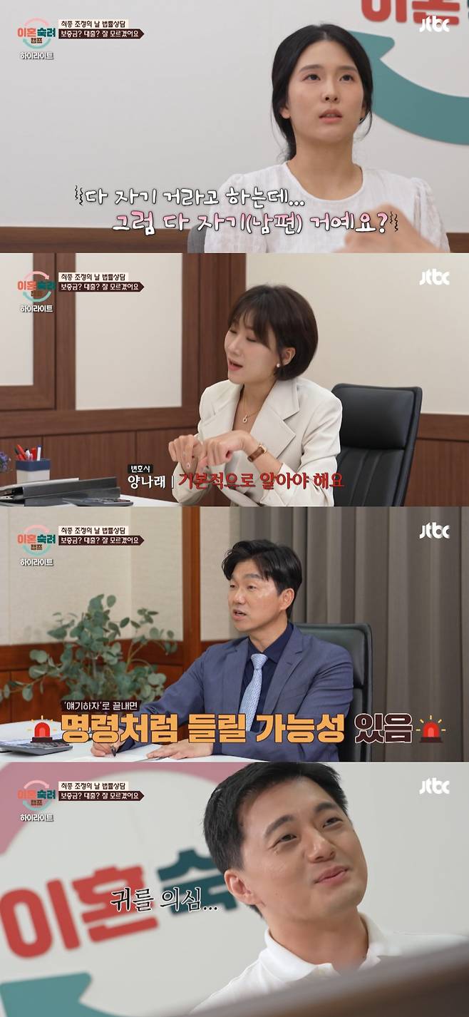 양나래 변호사는 재산분할을 묻는 아내에게 "본인 명의대로 재산 분할을 한다"며 아내에게 집의 보증금, 남편 명의 대출, 결혼 비용으로 각자 부담한 돈 등을 물었다.