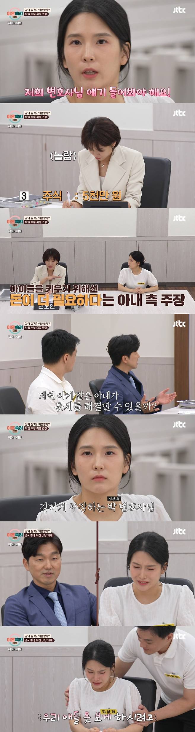 아내 측 변호사는 "아내가 발전할 의지가 있다"고 감쌌지만, 아내는 "제가 양육권 가질 거다"라며 조정 중에도 '뿌엥' 눈물을 터트렸다.