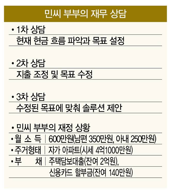 일단 첫 상담에선 워밍업으로 부부의 식비·생활비(85만원)를 살짝 조정했다. 부부는 거의 3일에 한번꼴로 배달음식을 시켜 먹는데, 이 횟수를 절반으로만 줄여 85만원에서 75만원으로 10만원 절감하기로 했다.