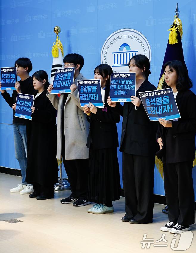 (서울=뉴스1) 안은나 기자 = 윤석열 탄핵소추 촉구 대학생 시국 농성단이 15일 서울 여의도 국회 소통관에서 국회를 향해 윤 대통령에 대한 즉각 탄핵 절차에 돌입해야 한다며 기자회견을 하고 있다. 2024.11.15/뉴스1
