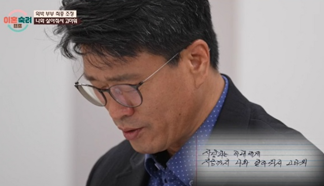 이들은 조정이 시작되고 재산을 5대 5로 나누고 퇴직금은 각자에게 귀속하는 것으로 원만하게 합의를 마쳤는데, 조정 마지막 단계에서 이혼을 원하지 않는 남편이 지난날을 반성하며 아내에 대한 마음을 담아 쓴 편지를 읽어 내려갔다.