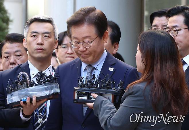 | ▲ 더불어민주당 이재명 대표가 15일 오후 서초동 서울중앙지법에서 열리는 공직선거법상 허위사실공표 혐의 1심 선고에서 징역 1년에 집행유예 2년을 선고받은 뒤 법정을 나와 입장을 밝히고 있다. |