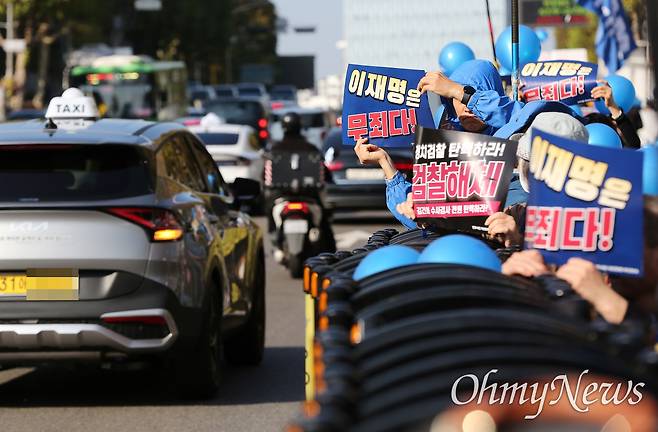 반면 이 대표를 반대하는 보수단체들은 서초동 지검과 법원 사이 도로에서 양 방향 한 개 차로씩을 차지하며 집회를 열었다. 이 집회 단상에는 "이재명 법정구속"이라고 쓰여 있었고, 참여자들은 태극기 또는 성조기와 함께 "재명아 깜방가라"고 적힌 손팻말을 들었다. 마이크를 잡은 일부 참여자는 "한동훈도 구속하라"는 구호를 외치기도 했다.