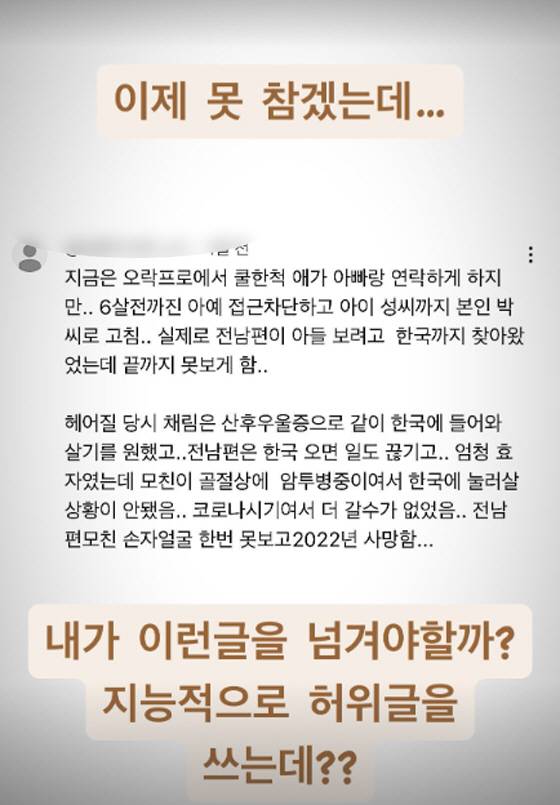 여기서 그치지 않고 "헤어질 당시 채림은 산후우울증으로 같이 한국에 들어와 살기를 원했고, 전 남편은 한국 오면 일도 끊기고. 엄청 효자였는데 모친이 골절상에 암투병중이어서 한국에 눌러 살 상황이 안됐음. 코로나 시기여서 더 갈 수가 없었음. 전 남편 모친 손자 얼굴 한번 못보고 2022년 사망함"이라고 적혀 있었다.