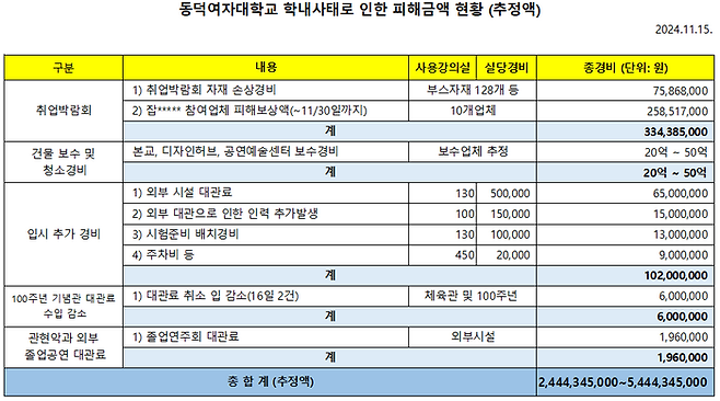 15일 동덕여대는 최근 학내 사태로 인한 피해 금액 총액이 최소 24억원에서 최대 54억원에 달하는 것으로 추정된다고 밝혔다.