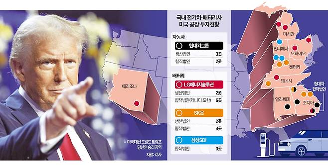 완성차 및 배터리 업체들은 ‘트럼프 2.0’ 시대에 기존 룰이 바뀔 것이라는 데 이견을 달지 않는다. 다만 보조금을 전액 폐지하는 등 급격한 변화는 없을 것으로 예상해왔다. 한 배터리업체 대표는 최근 “대부분 배터리 공장이 공화당이 지역구로 있는 지역에 밀집해 있다”고 지적했다. 트럼프 당선인과 공화당 후보에게 표를 몰아준 지역의 경제를 침체시키는 행위를 하기는 어려울 것이란 예상이 많다.