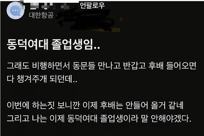 현재 승무원인 것으로 추정되는 한 동덕여대 졸업생은 앞서 직장인 익명 커뮤니티 게시판에 "비행하면서 동문 만나면 다 챙겨주게 됐는데 이제 후배가 안 들어올 것 같다"면서 "나는 이제 동덕여대 졸업생이라고 말하지 않겠다"고 안타까움을 표했다.