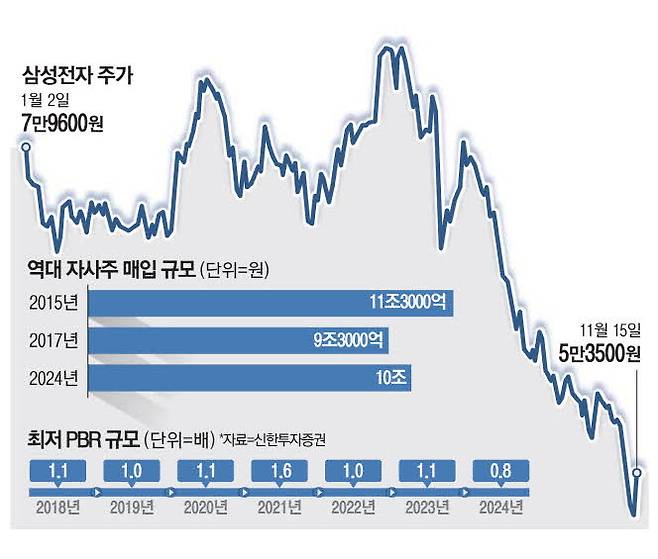 삼성전자의 밸류에이션이 역사적 최저 수준까지 떨어지면서 주가 부양과 자사주 매입을 요구하는 목소리도 높아졌다. 신한투자증권에 따르면 삼성전자의 주가순자산비율(PBR)은 14일 기준 0.8배로 역사적 저점이다.