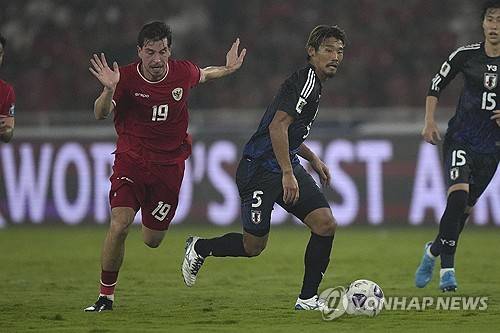 Japan's Hidemasa Morita, right, battles for the ball against Indonesia's Thom Haye during their 2026 World Cup Asian 3rd round qualifier soccer match at Gelora Bung Karno Main Stadium in Jakarta, Indonesia, Friday, Nov. 15, 2024. (AP Photo/Achmad Ibrahim)