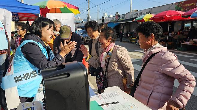 | ▲ 국민투표 행사를 주관한 오은미 전북도의원(순창군·진보당)이 주민들에게 윤석열퇴진국민투표를 실시하는 이유를 설명하고 있다. |