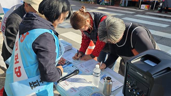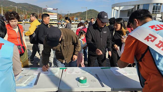| ▲ 전북 순창군 순창읍 5일장터를 찾은 주민들이 '윤석열퇴진국민투표'를 하고 있다. |