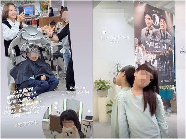 세은 양은 미용실에서 스트레이트펌을 하고 있고 소유진은 그 옆에서 살짝 춤을 춘다.