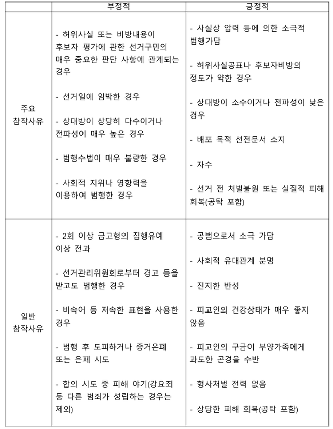 그렇다면 이재명 대표에게 적용된 당선목적 허위사실공표죄에 해당하는 특별양형인자는 어떤 것이 있을까요? 피고인에게 유리한 특별양형인자(감경요소)와 불리한 특별양형인자(가중요소)는 다음과 같습니다. (참고로 당선목적 허위사실공표와 후보자 비방, 낙선목적 허위사실공표에는 모두 동일한 특별양형인자가 적용됩니다.)