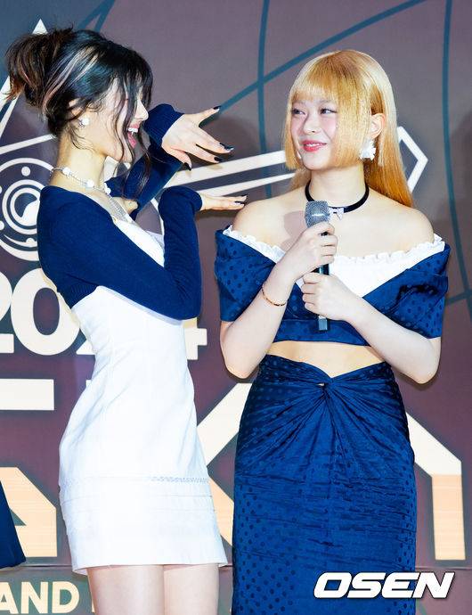 뉴진스 하니가 인터뷰를 할때 다니엘의 기를 받고 있다. 2024.11.16 / rumi@osen.co.kr