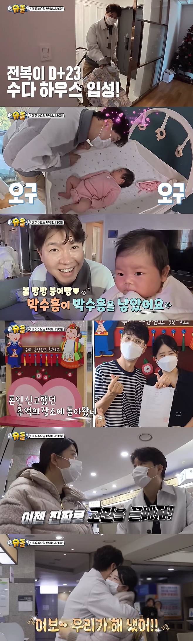 한편 박수홍과 김다예는 전복이 출생신고를 하기 위해 구청을 방문했다. 박수홍은 "여보 기억나냐. 우리 말도 안 되게 힘들었을 때 여기서 혼인신고 했다. 우리가 전복이를 만난 줄 알았냐. 그때 우리 여기서 사진 찍을 때 생각하면 진짜 지금 행복하다"며 감회에 잠겼다.