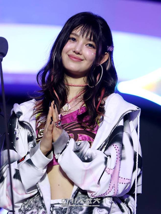 다니엘 등 뉴진스가 16일 인천 중구 운서동 인스파이어 아레나에서 열린 '2024 코리아그랜드뮤직어워즈(KGMA)' 첫째날 아티스트데이에서 베스트 아티스트상을 받고 수상소감을 말하다 재밌는 표정을 짓고 있다.