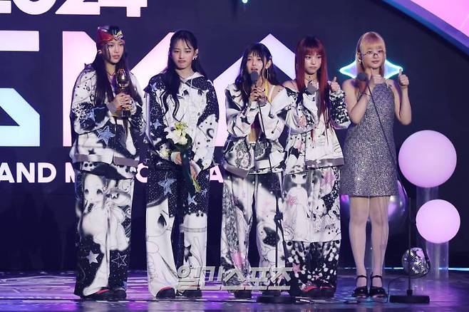 그룹 뉴진스가 16일 인천 중구 운서동 인스파이어 아레나에서 열린 '2024 코리아그랜드뮤직어워즈(KGMA)' 첫째날 아티스트데이에서 ‘베스트 아티스트’상을 수상하고 수상소감을 밝히고 있다.