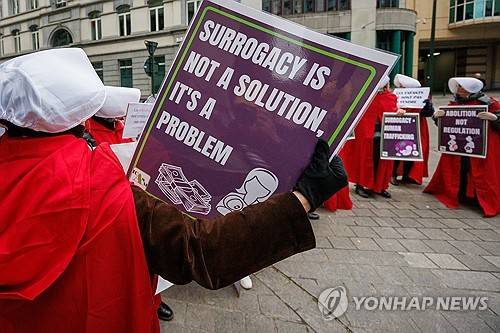 epa11724466 Women Against Surrogacy Belgium protest against the 'Men Having Babies' gathering in Brussels, Belgium, 16 November 2024. The American 'Men Having Babies' organization travels annually to the heart of Europe to attract clients, primarily focusing on single and homosexual men from countries where surrogacy is not allowed. Women Against Surrogacy Belgium condemns this practice by advocating for women, the children born through surrogacy, and the fundamental fight for women's rights. EPA/OLIVIER MATTHYS